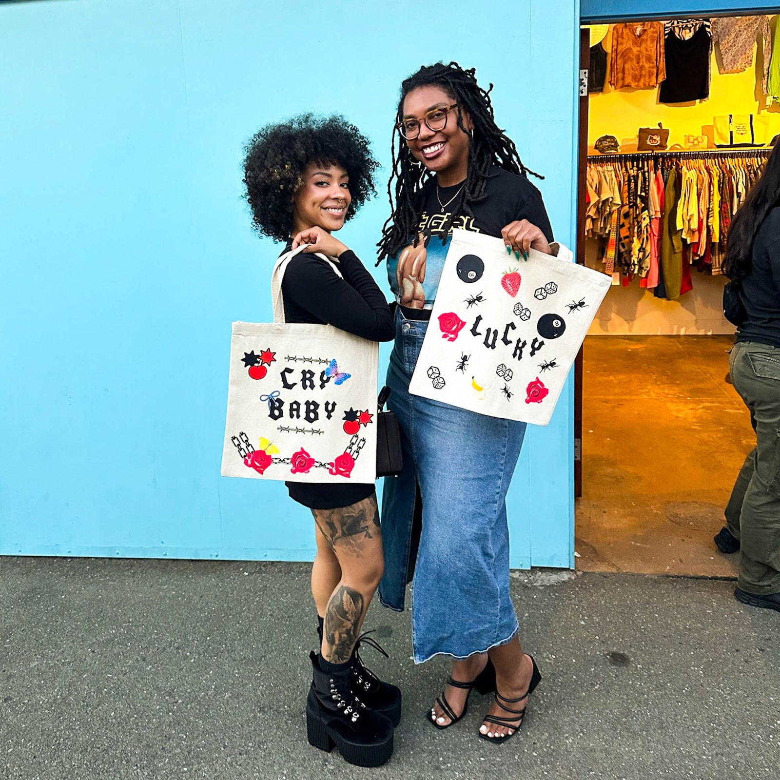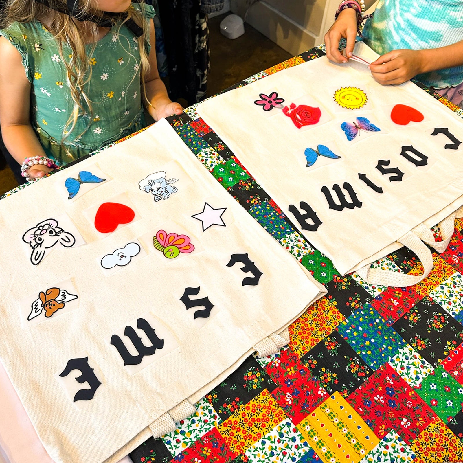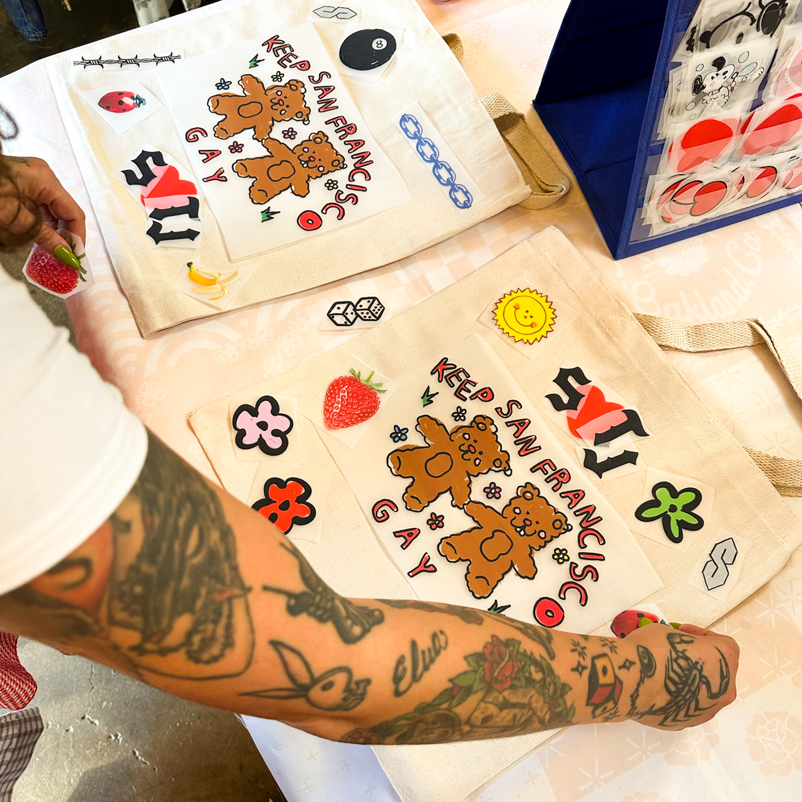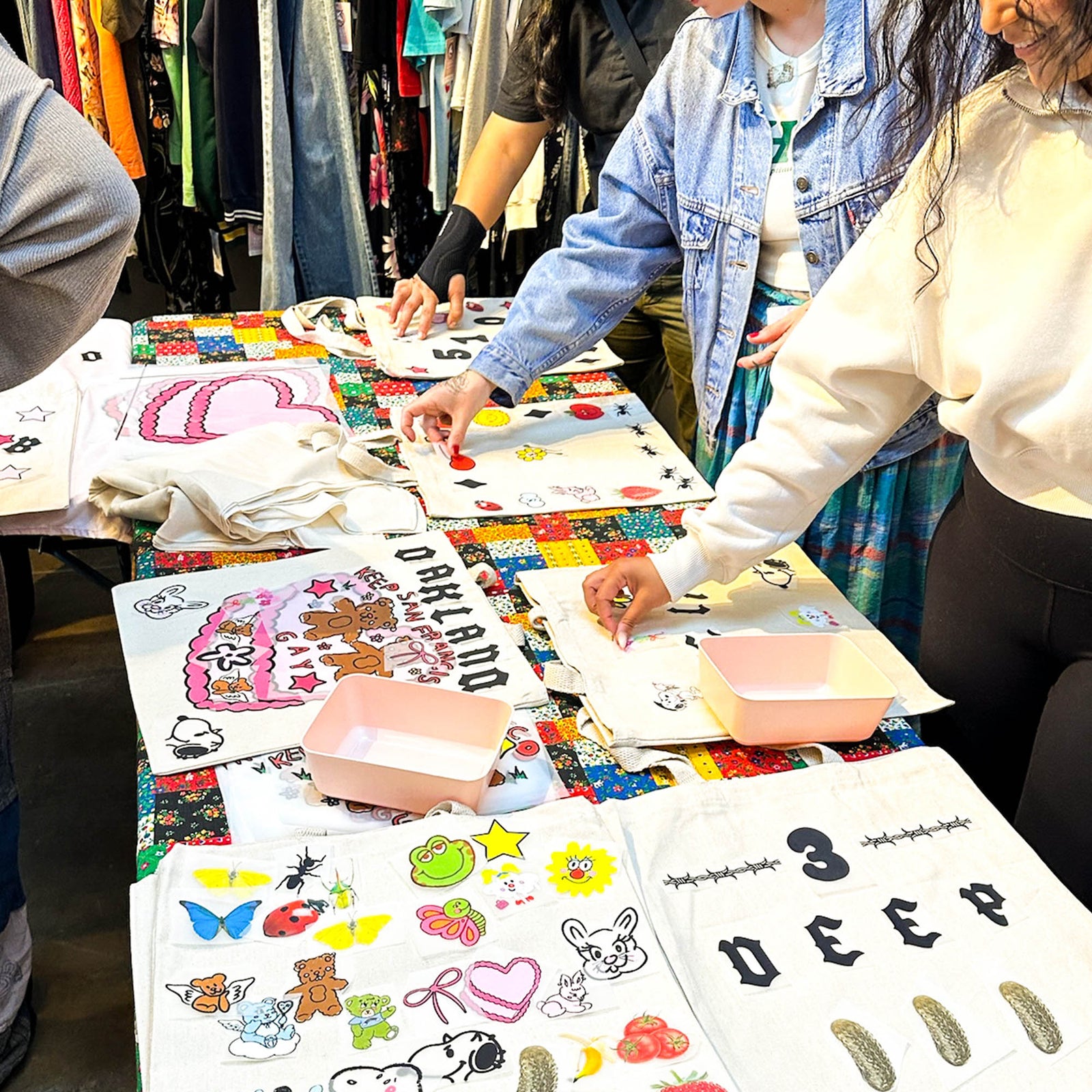 Once all set up, we walk folks through the process and from there most people jump in and start designing! Once they are done, we press their bag on site and its ready to take home ✦